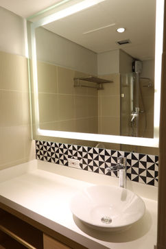 The patterned tiles continued to the bathroom. To maximize storage, a vanity cabinet is added. A small vessel sink made the T&B elegant.